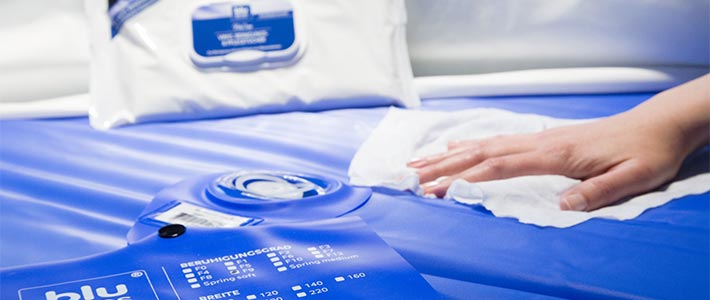 Damit Sie sich jederzeit in Ihrem Wasserbett wohl fühlen, ist es wichtig, regelmäßig die Oberfläche der Wasserbettmatratze zu reinigen. Dafür gibt es spezielle Vinylreiniger für Wasserbettmatratzen. Über den Reinigungseffekt hinaus zeichnen sie sich durch eine Pflegewirkung aus. So sorgen die Reiniger dafür, dass die Wassermatratze angenehm geschmeidig bleibt. Das trägt zudem dazu bei, dass Sie länger Freude an Ihrem Bett haben. Die Anwendung ist ganz einfach: Den Vinylreiniger sprühen Sie großflächig auf die Matratze, um ihn mit einem weichen Tuch einzureiben. Oder Sie nehmen direkt unsere praktischen Pflegetücher, die bereits mit dem Pflegemittel vorgetränkt sind.